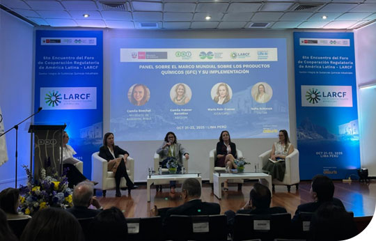 A Abiquim – representada por Camila Hubner Barcellos, gerente de Regulatórios e Sustentabilidade, e Elaine Faquim, assessora de Assuntos Regulatórios, - marcou presença no 6º Encontro do Fórum de Cooperação Regulatória da América Latina (LARCF), realizado em Lima, Peru, nos dias 21 e 22 de outubro. O evento reuniu representantes da indústria química, governos da região, OCDE, PNUMA, UNITAR e ICCA para discutir os avanços do Global Framework on Chemicals (GFC) e as atualizações regulatórias de países como Brasil, Chile, Colômbia, Peru e Costa Rica — incluindo temas como a implementação do GHS (Global Harmonization System), legislações sobre inventários e controle de riscos de substâncias químicas, boas práticas regulatórias e cooperação internacional.
